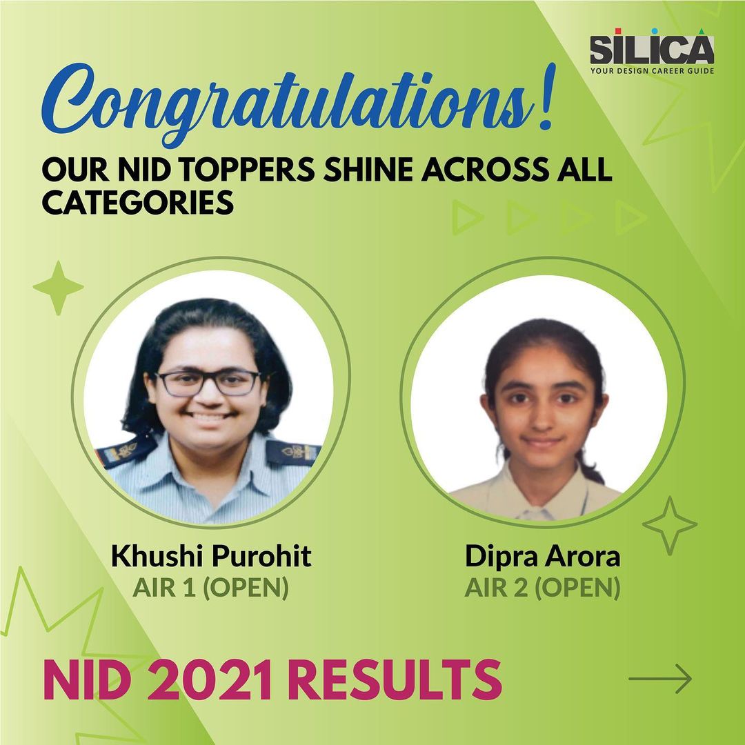 Khushi Purohit and Dipra Arora, who joined Silica Institute for design entrance preparation, achieved AIR 1 and AIR 2 respectively at NID DAT Mains 2021, in the Open Category.